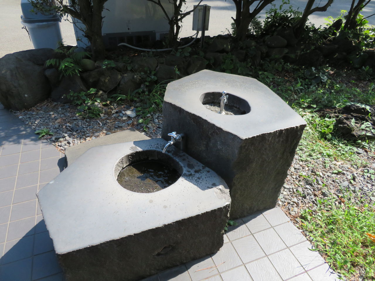 トイレの建物の前、入口通路の左右に手洗い用の蛇口と飲用の蛇口が各1つずつあります。