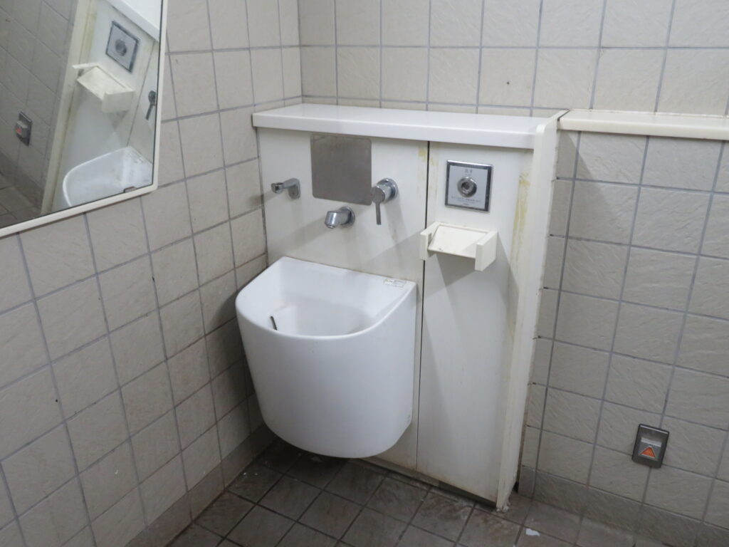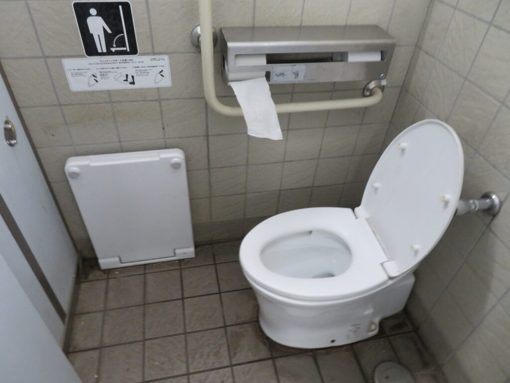 多機能トイレは④番トイレと同じくここにも手洗場がありませんでした。オストメイト設備が手洗場の代替設備になりそうですが、使い勝手が悪いと思いますので手洗い器の設置が望ましいです(スペース的には設置できそうですし)。