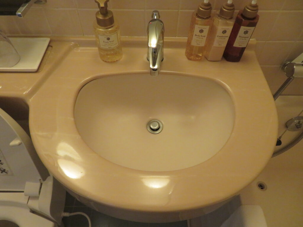 手洗場はINAX(LIXIL)製と思われますが、品番は不明です。この形状はユニットバスでしか見たことがありません。