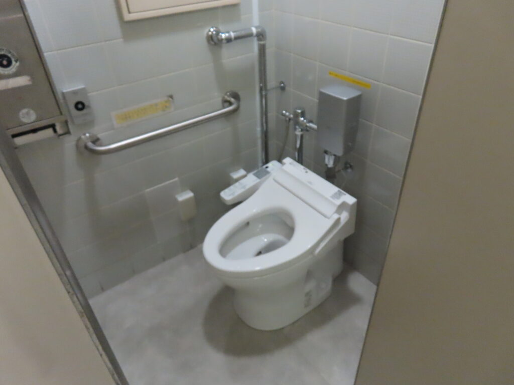 多機能トイレは新しめですが、なぜか乳幼児設備がありませんでした。たしかに室内は広いとは言えませんが、配置を工夫したりオストメイト設備をパウチ・しびん洗浄水栓付背もたれにすればベビーシートの設置ができそうな気がします。