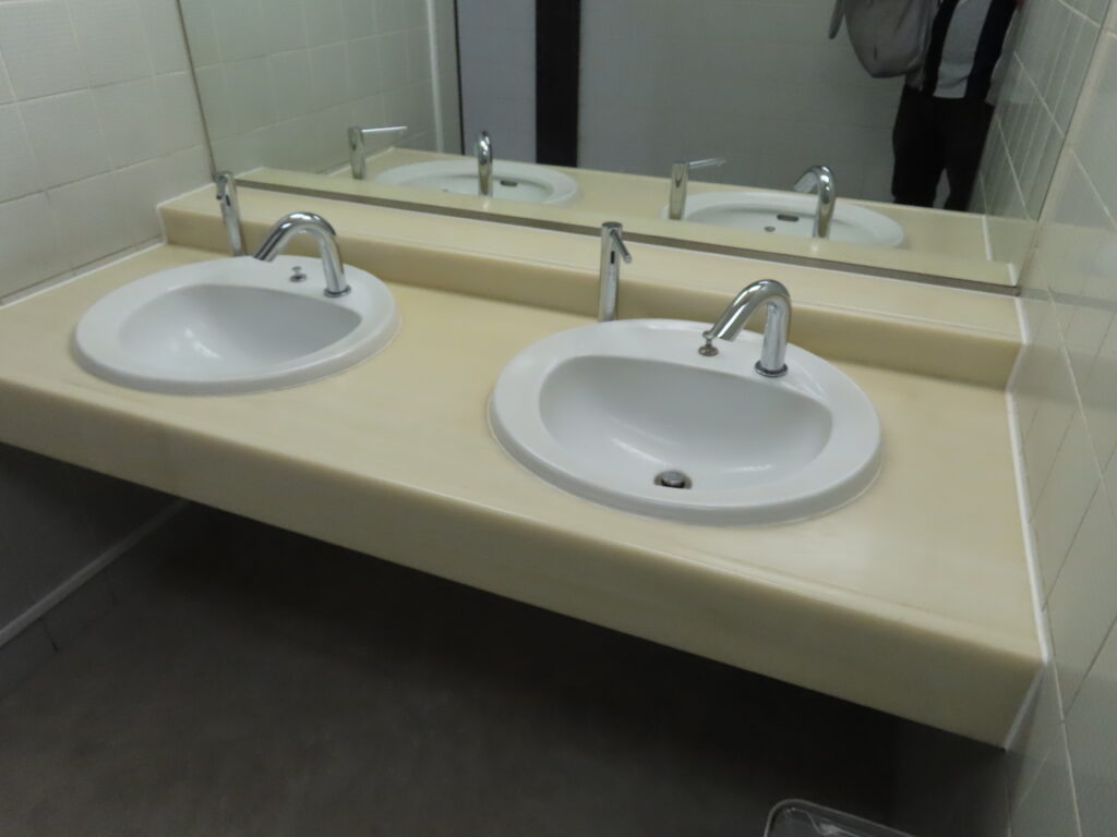 手洗場はINAX(LIXIL)のL-2394AP(と思われる)が2台の設置です。2024年11月時点で自動水栓に交換されていましたが、