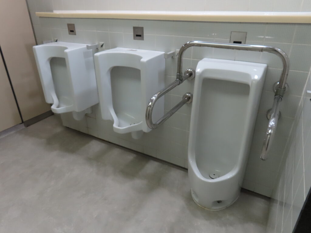 小便器はINAX(LIXIL)のU-801SCD(床置式、手すりあり)が1台とU-104UD(壁掛式)が2台の合計3台の設置です。2024年11月時点で床面が長尺シートになっていましたが、