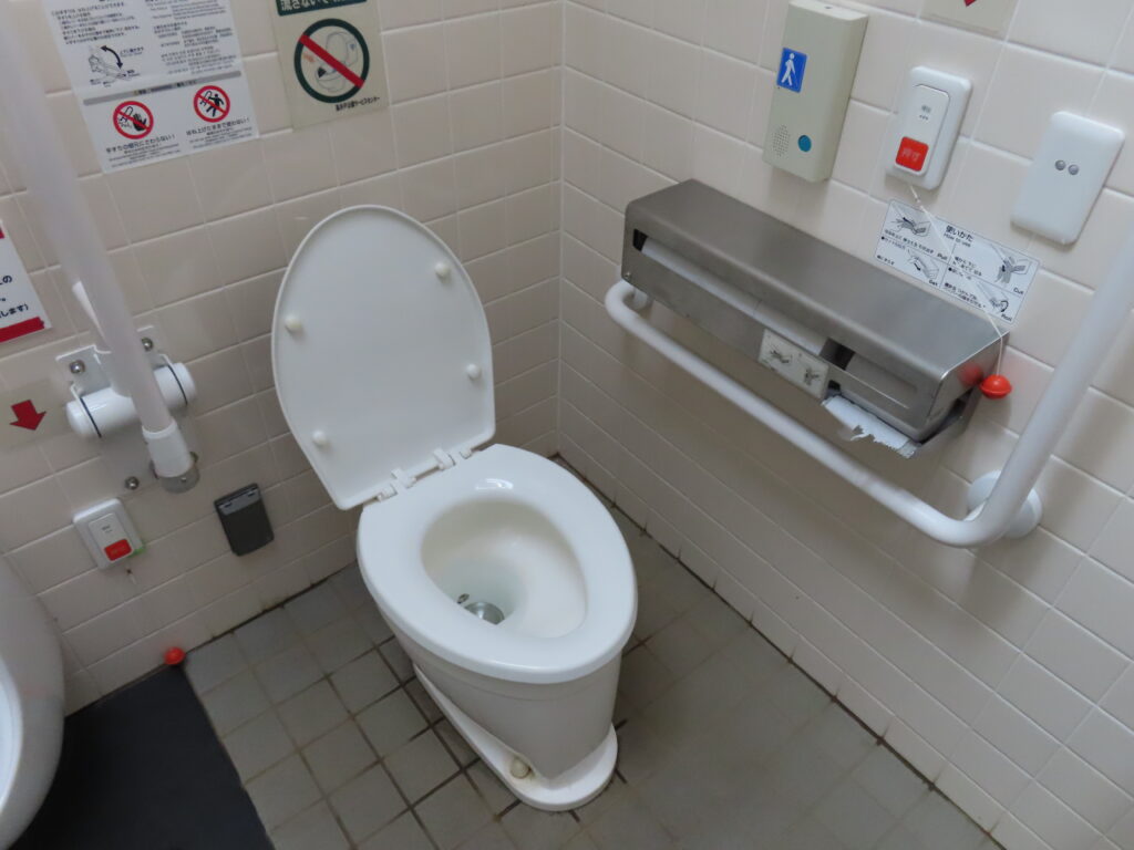 こちらも便器はアルソナ技研製の「アルソナα」が設置されています。都立公園では一部の公園を除いてここ数年の間に建てられたトイレでは「アルソナα」が採用される傾向にありますが、多機能トイレに関してはこの便器が設置される場合と一般的な洋式便器が採用される場合のどちらもあります。