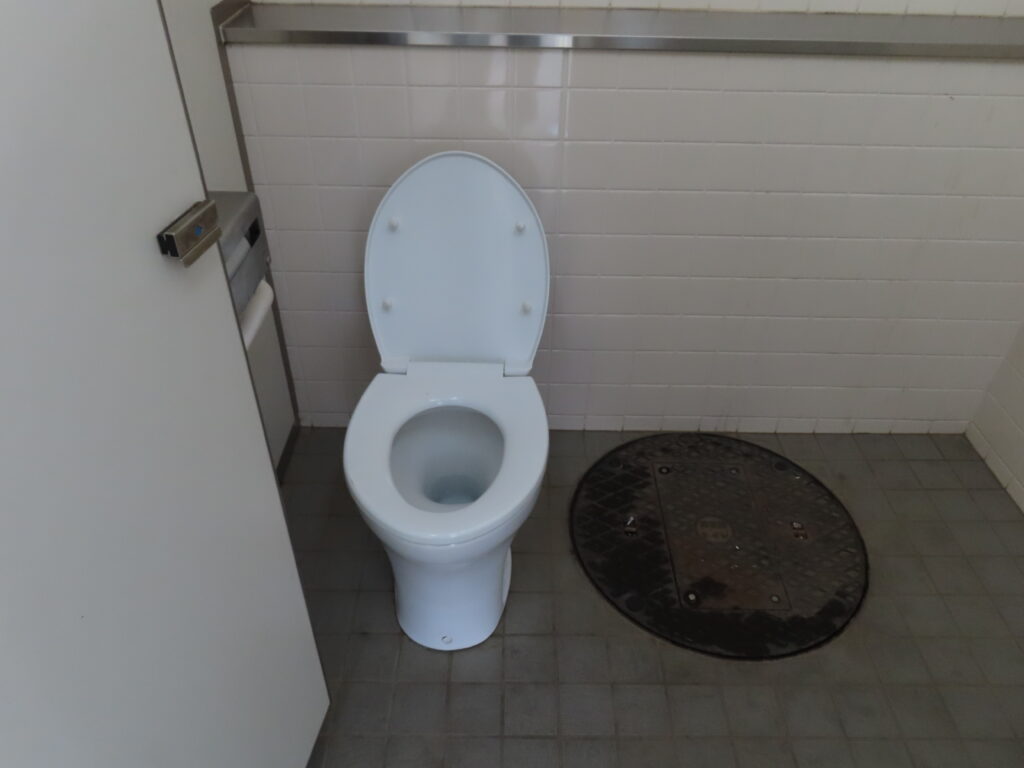 ここがトイレ①との大きな違いです。トイレ①ではこの個室は和式となっていてなおかつ便器の配置やマンホールトイレの位置が異なっています。