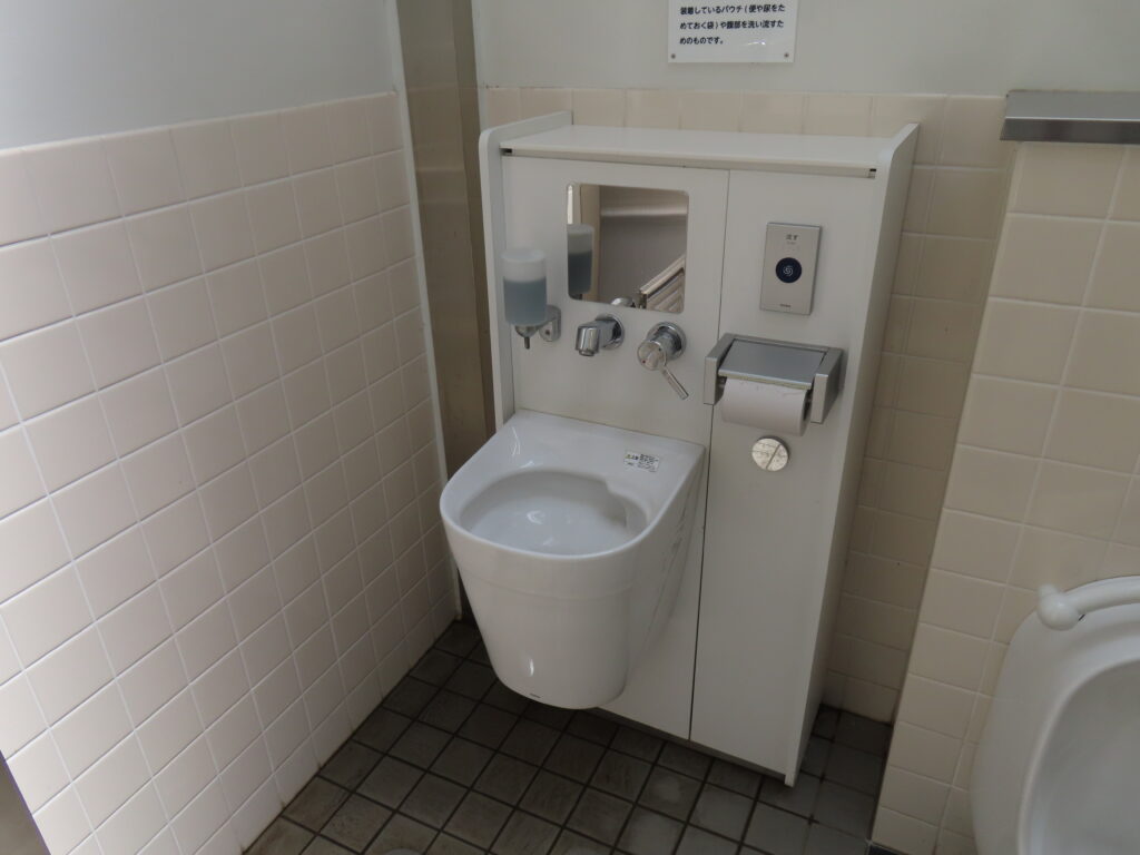 向かって左側の個室はアルソナ技研製の「アルソナα」が設置されています。災害時対応の便器です。