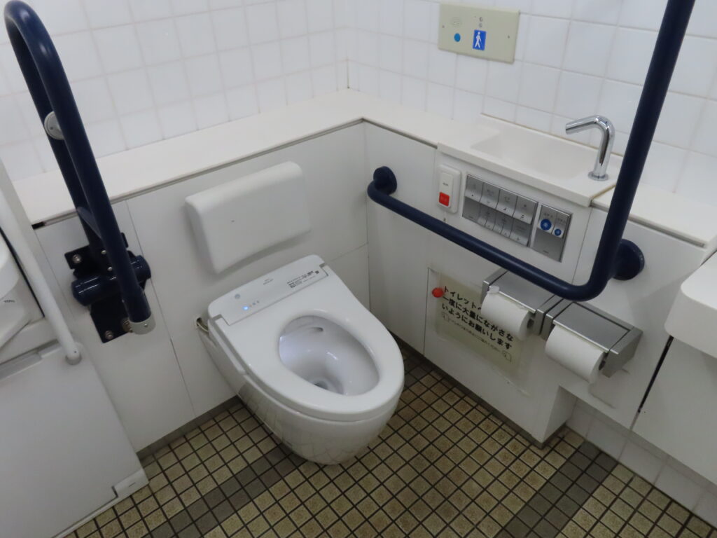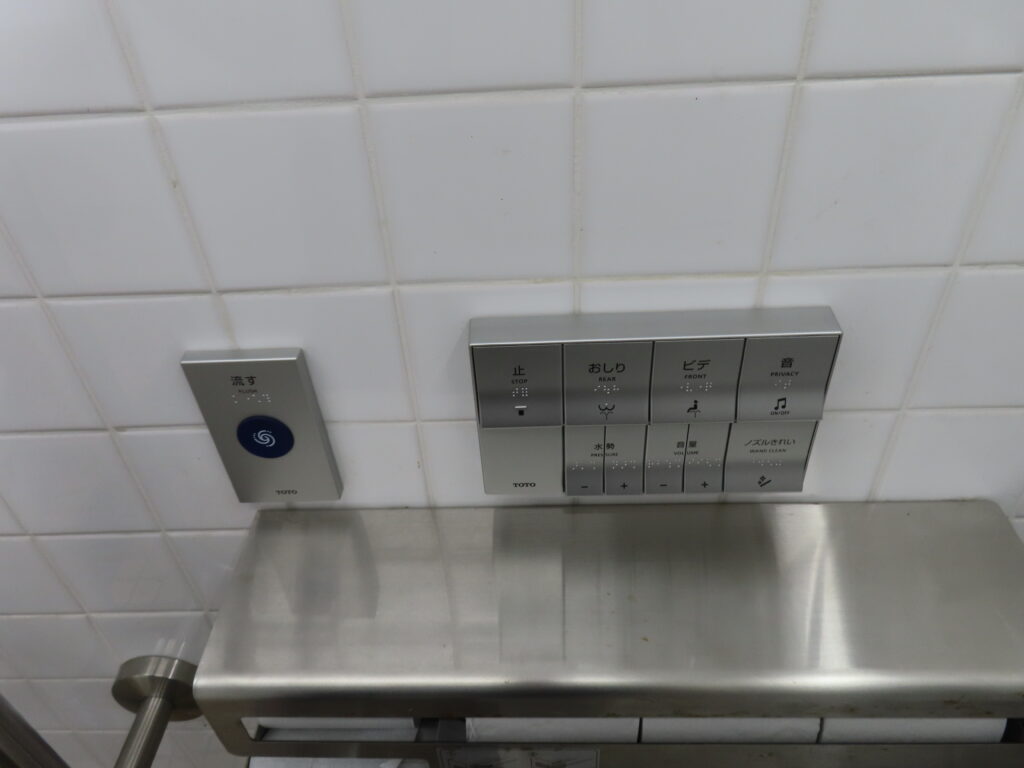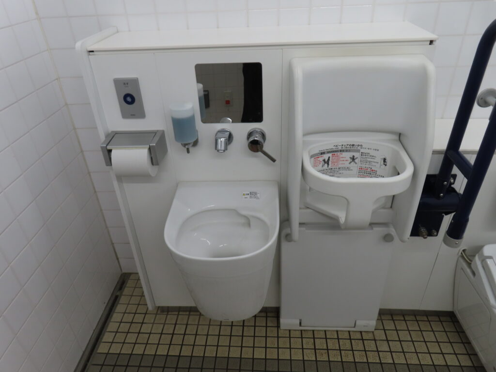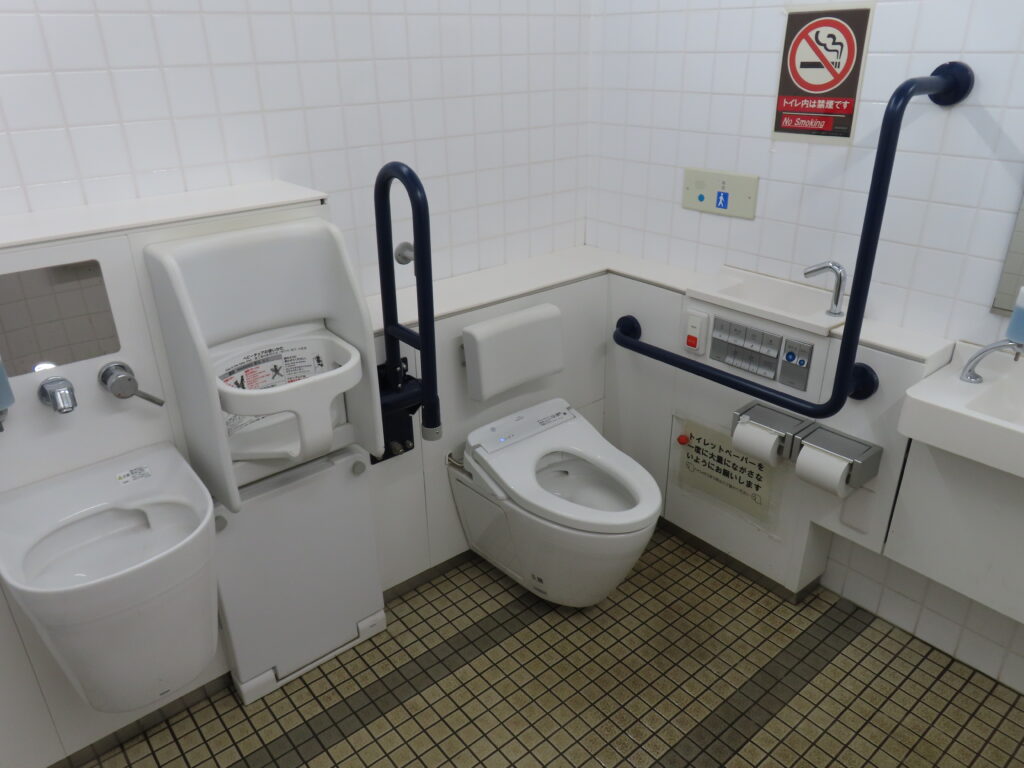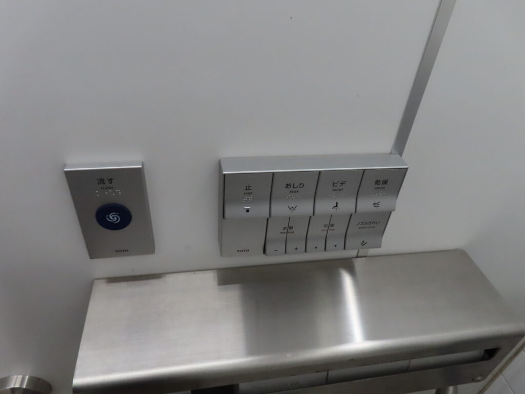 トイレ①やトイレ②よりも設備はよく、多機能トイレの洗浄装置もここはちゃんと車いす使用者でも扱いやすい造りになっていますが、一方で室内はトイレ①やトイレ②よりも狭いことや幼児用小便器がないのが残念なところです。