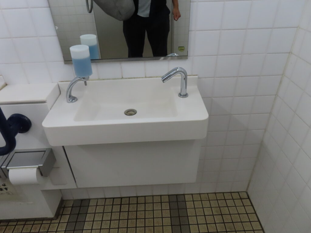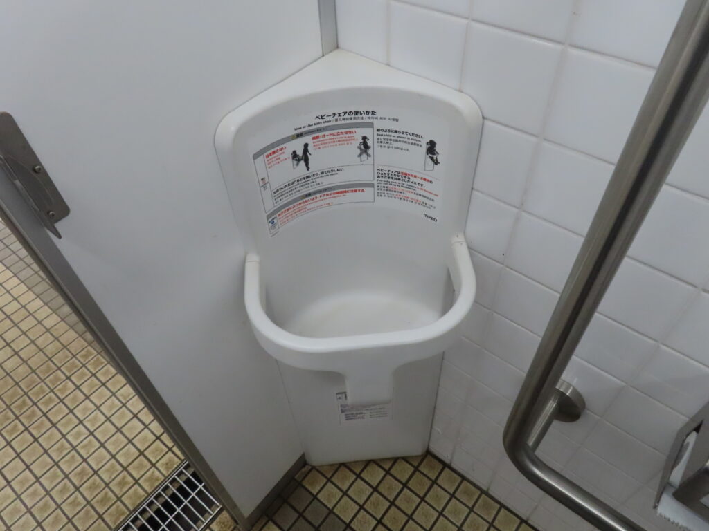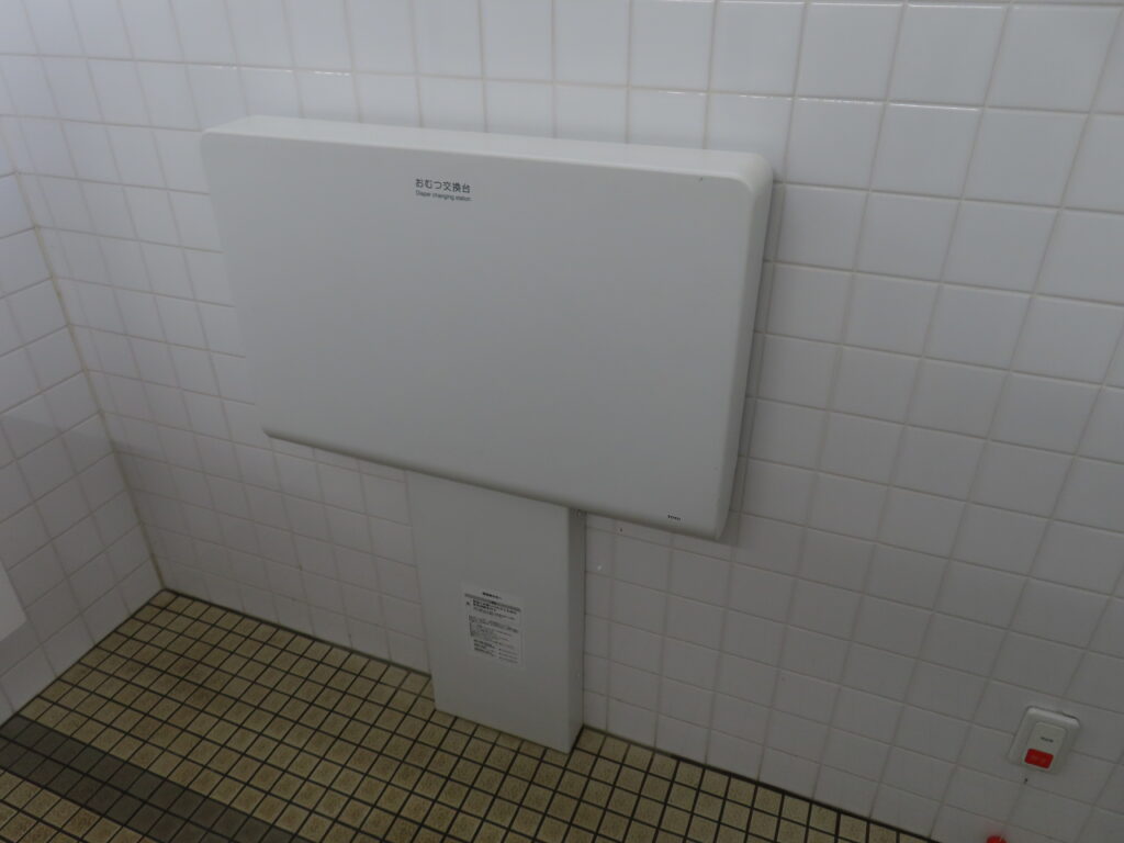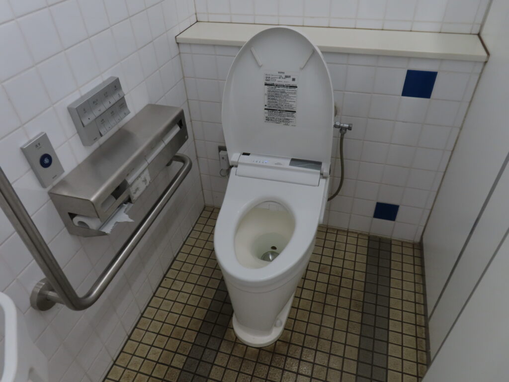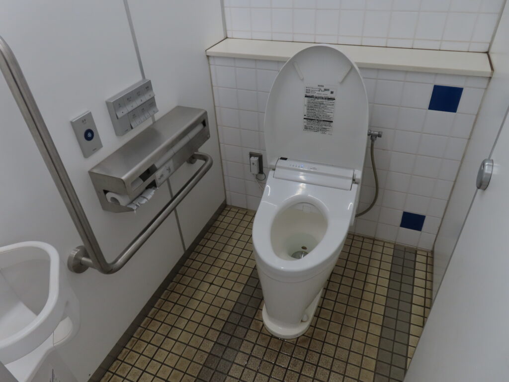 トイレ①やトイレ②よりも設備はよく、多機能トイレの洗浄装置もここはちゃんと車いす使用者でも扱いやすい造りになっていますが、一方で室内はトイレ①やトイレ②よりも狭いことや幼児用小便器がないのが残念なところです。