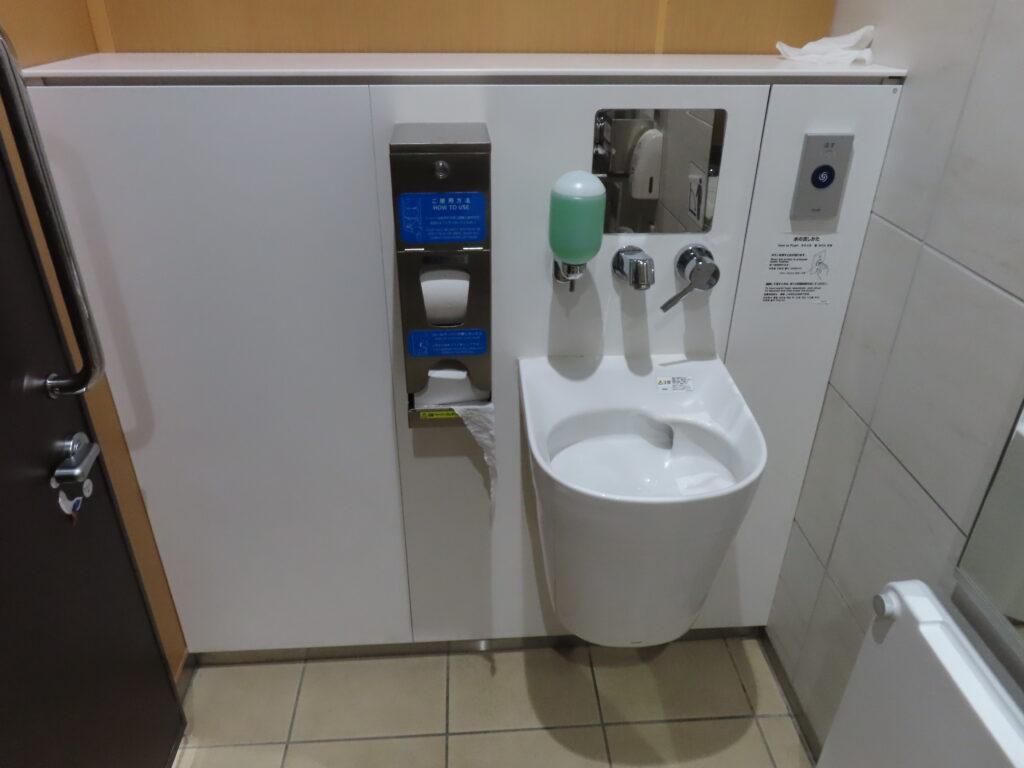 この個室には便器付近に小型手洗器(TOTO L90DR)が設置されています。