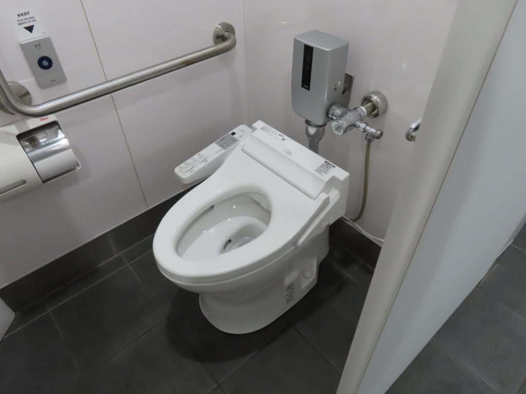 手前の個室はTOTOの「パブリックコンパクト便器・フラッシュバルブ式」CS494J(と思われる)が設置されています。便座はTOTOウォシュレットP(TCF587Y)です。