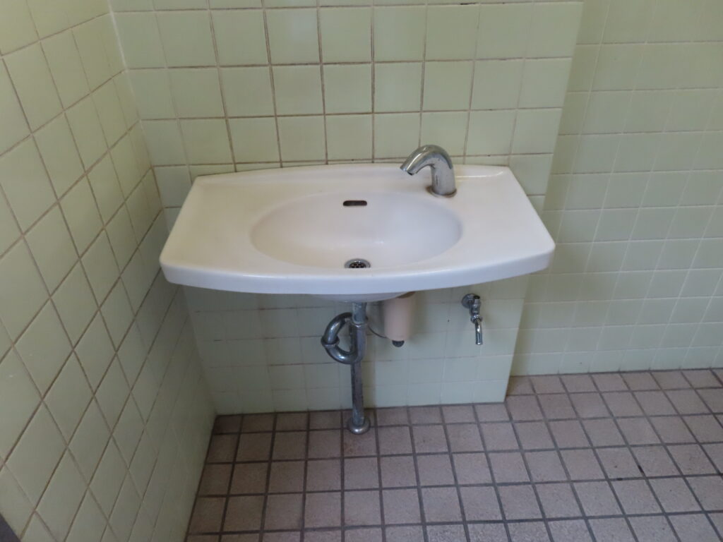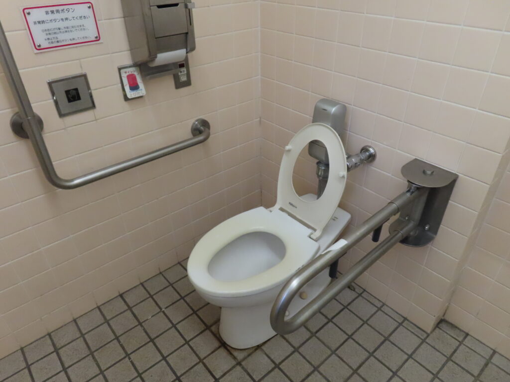 見た目は古いですが、中は改修されたようです。実際にグーグルストリートビューで2009年12月に撮影されたものを見る限りでは外観がタイル張りで古そうなトイレが写っています。この当時はまだ多機能トイレもないようでした。