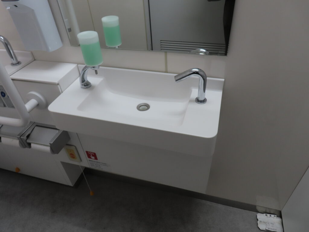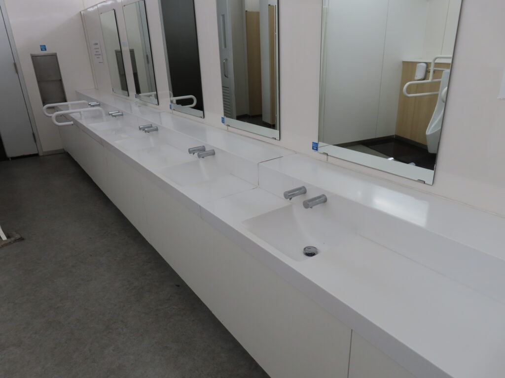 手洗場はTOTOのマーブライトカウンターが5連の設置です。小便器や大便器の個数に対して手洗場の数がやけに多いような気がします。