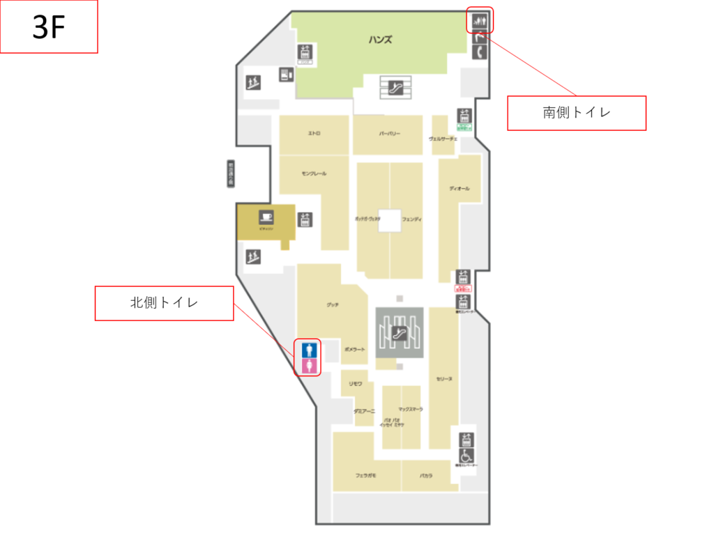タカシマヤタイムズスクエア本館では唯一多機能トイレの設置がないフロアになります。上下の階(2Fと4F)には多機能トイレの設置がありますが2Fよりも4Fのほうがお勧めです(直上にあることと改修されてきれいな為)。