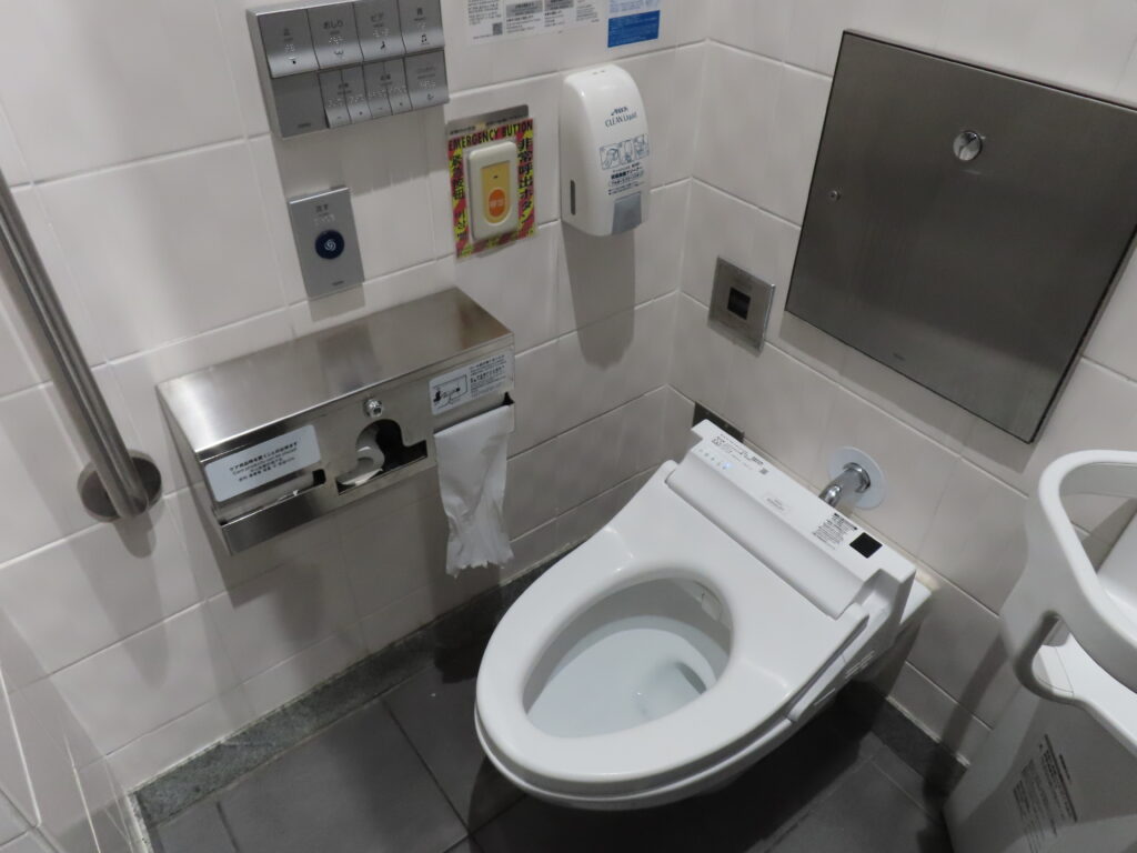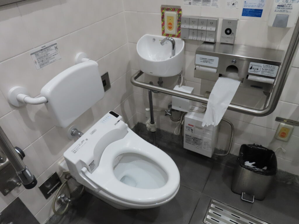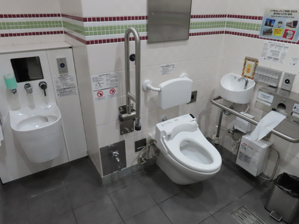 こちらは多機能トイレが設置されていますが、ホームからエレベーターが通じていません(エレベーターが通じているのは東口)。地上1Fにあるので東口を出て公道を経由すればかろうじて利用できそうですが、不便だろうと思います。