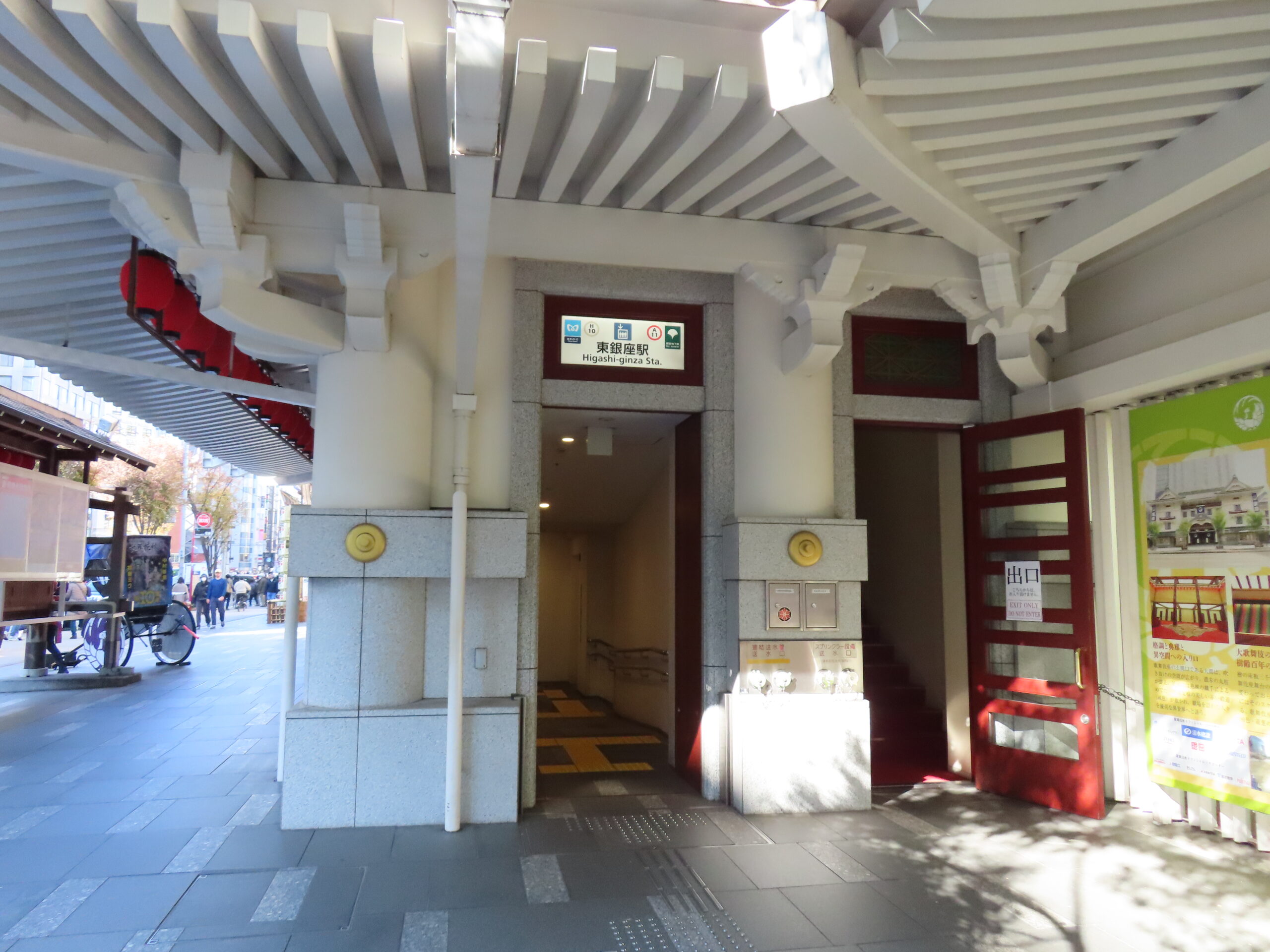 東京の観光名所でもある歌舞伎座はこの駅の真上にあり、3番出口を上がってすぐの場所にあります(というか歌舞伎座の敷地内に3番出口がある)。