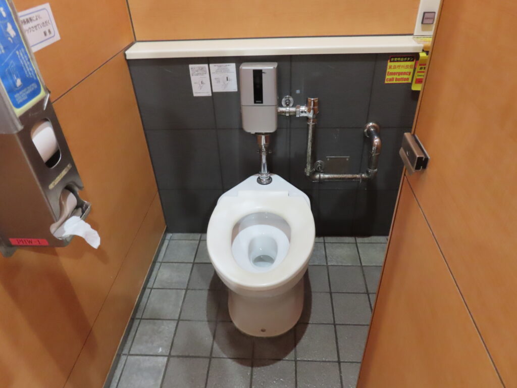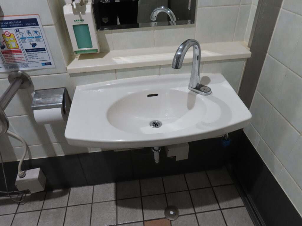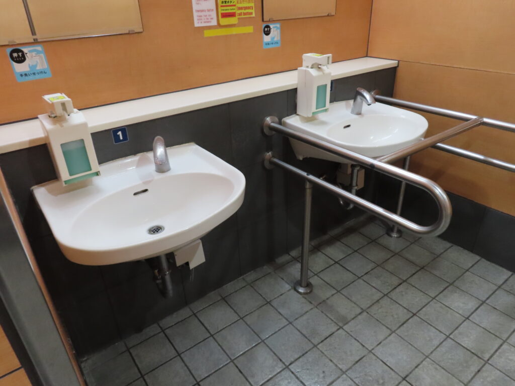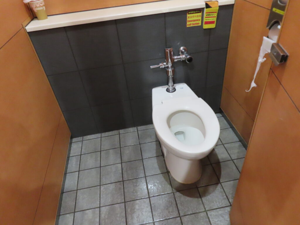 設備が非常に充実している都営地下鉄側のトイレと比べてこちらはいろいろと劣っているように感じます。まあこちらのトイレのほうが古いということもありますが。