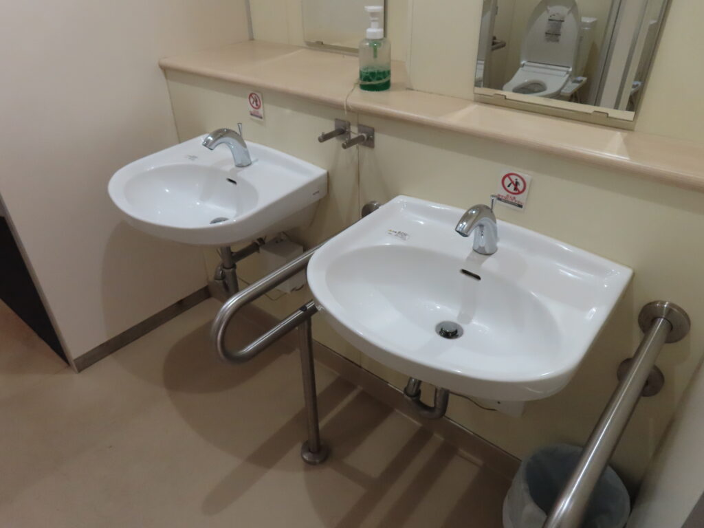 現在は高架化工事中なこともあってかどちらのホームもトイレは仮設になっていますが、使用期間が異なる為か温水洗浄便座や乳幼児設備、多機能トイレの有無など設備が大きく異なります(1番線ホームのトイレに関しては水洗式ですらない)。