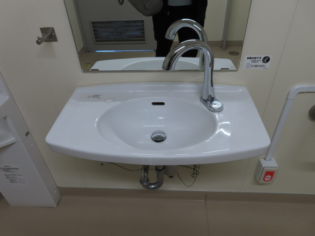 後述する2番線ホーム側のトイレと比べて使用期間が短いとは言え、いくら何でも簡易水洗式はいかがなものかと思いました。ここは都内ですし、当たり前のこと上下水道が完備されている地域です。せめて水洗式にするべきだったのではないかと思います(「Varie」には水洗式仕様のものもありますし)。しかも2~3年ほど使われているわけですし。