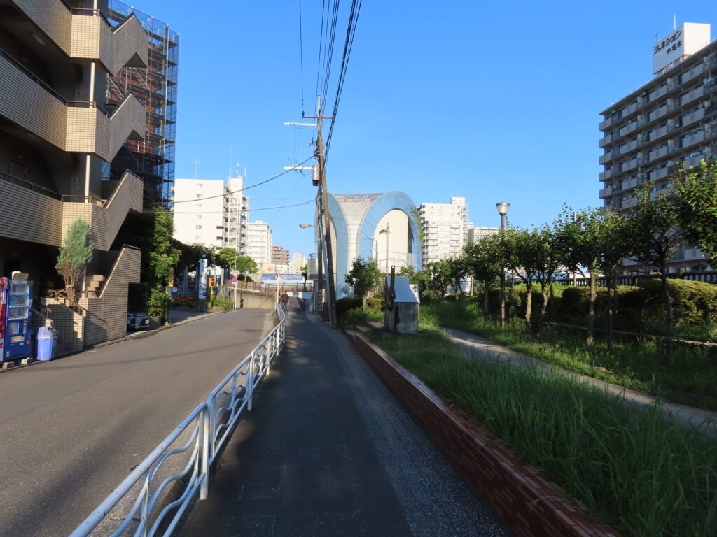 遠くに見える青いアーチが特徴の建物が公衆トイレです。なかなか特徴的な建物です。