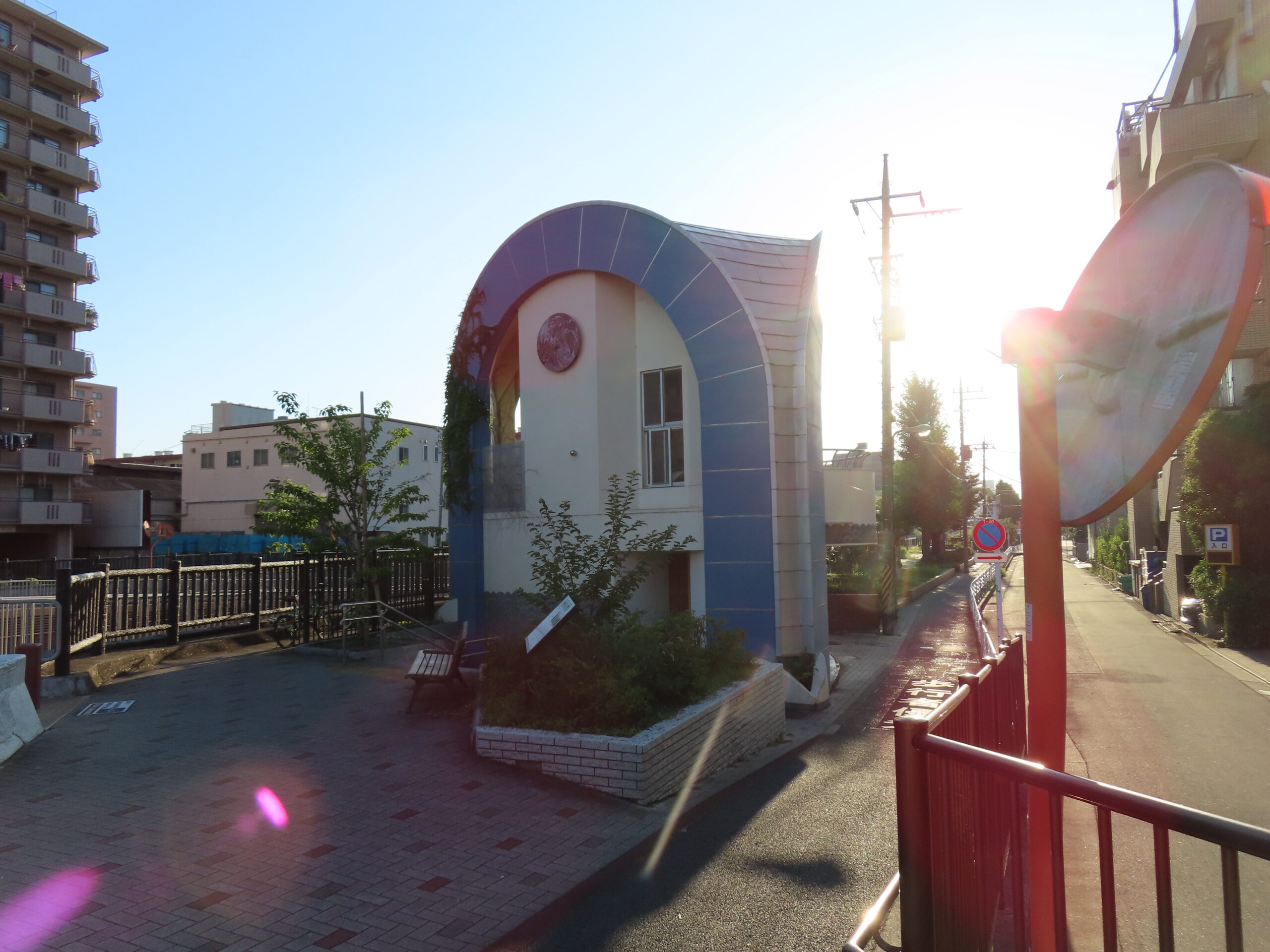 遠くに見える青いアーチが特徴の建物が公衆トイレです。なかなか特徴的な建物です。