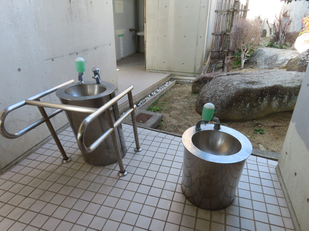手洗場の背後は中庭になっています。第1トイレと第2トイレは壁などもなく開放的な造りになっていましたが、このトイレの場合は建物の裏側に園路がある為か、中庭になっています。
