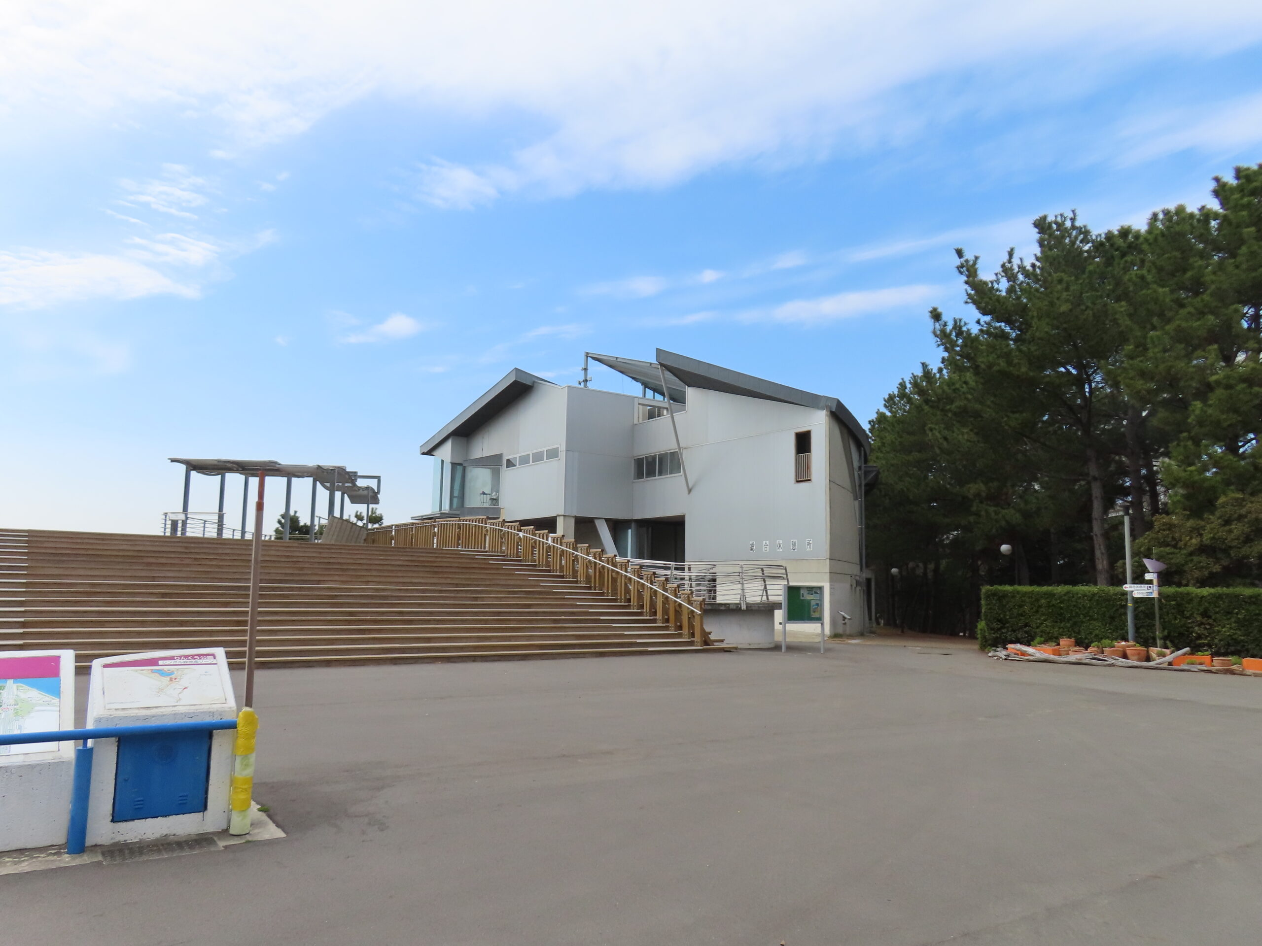 総合休憩所はシンボル緑地の夕日の見える丘に面した場所にあります。りんくうタウン駅から来ると公園に入って一番最初に見える建物がこれになります。