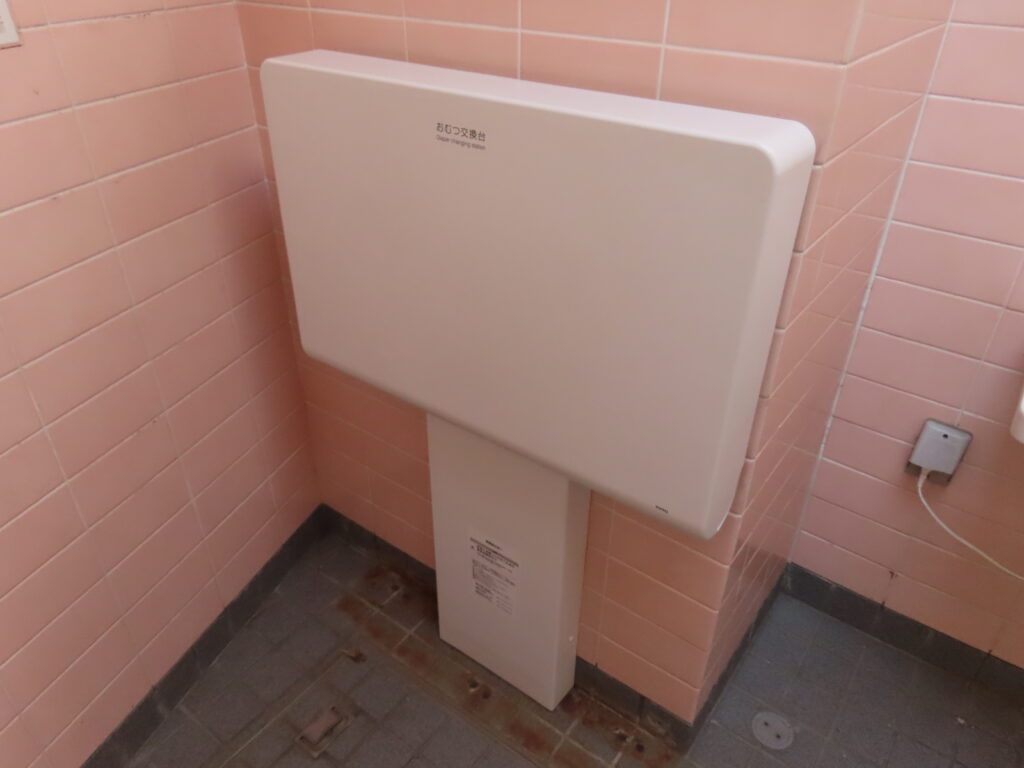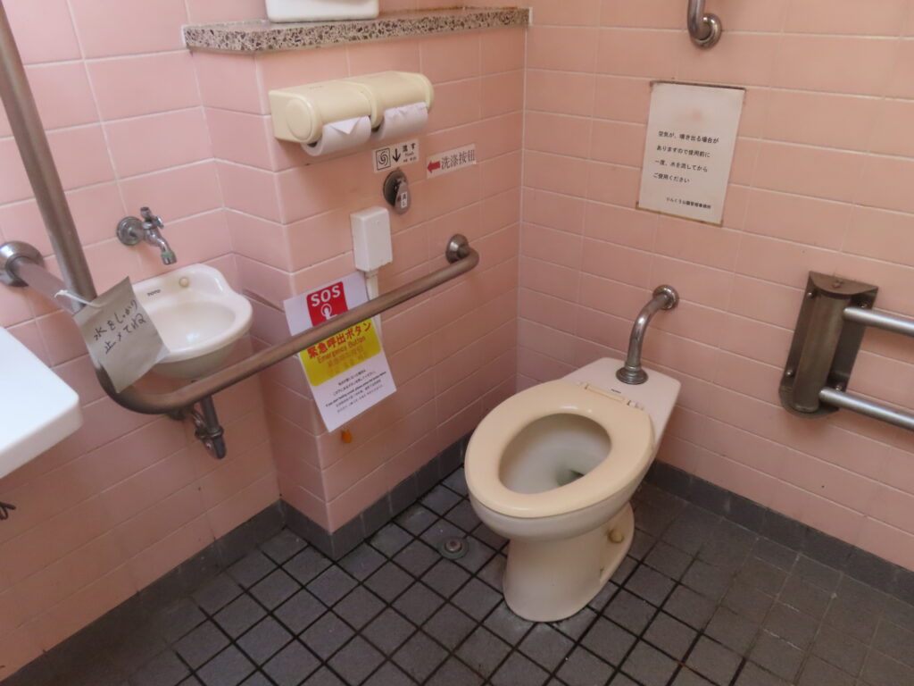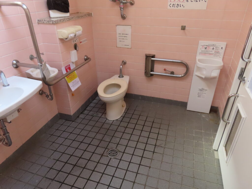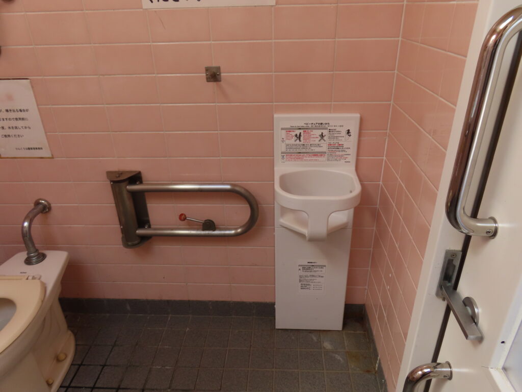 最初は外観と男性用トイレの比較的新しい器具を見て最近できたトイレなのかと思ってしまいましたが、多機能トイレを見て意外と古かったことに気づきました(男性用トイレもよく見れば小便器や大便器周りのタイルが貼り変えられていますし)。